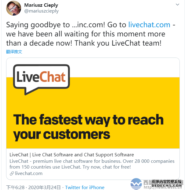 上周,實時聊天軟件和服務臺軟件Livechat的CEO在推特上公布,Livechat正式使用全新域名livechat.com,并稱為了這個域名,他們已經等候了十年。